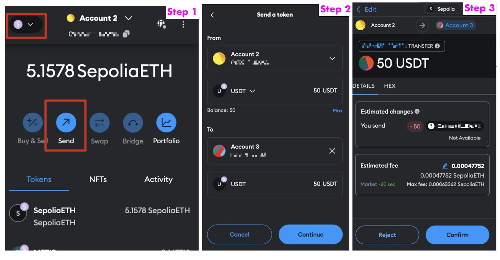 Taking MetaMask as an example, click on the network in the upper left corner of MetaMask and switch to the same network as the one selected on the deposit page. Then click the "Send" button. Fill in the token and amount you wish to deposit and transfer on the sending page. After clicking Continue, check whether the transaction information is correct, and finally click the "Confirm" button to complete the transfer.