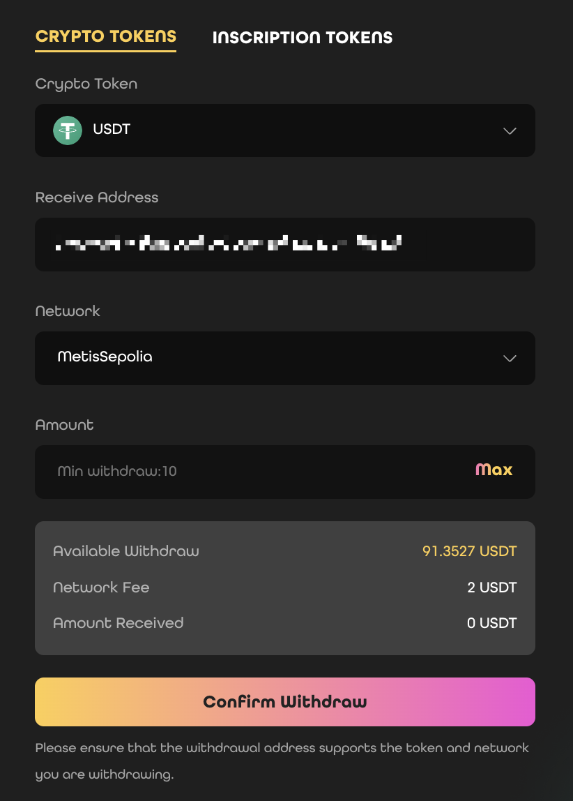 Next, enter the address of your wallet where you will receive the funds, making sure that the network selected in NuDEX matches the network of your wallet, a good habit in blockchain operations is to verify and confirm the addresses up to 2 times, otherwise, you could lose the funds.