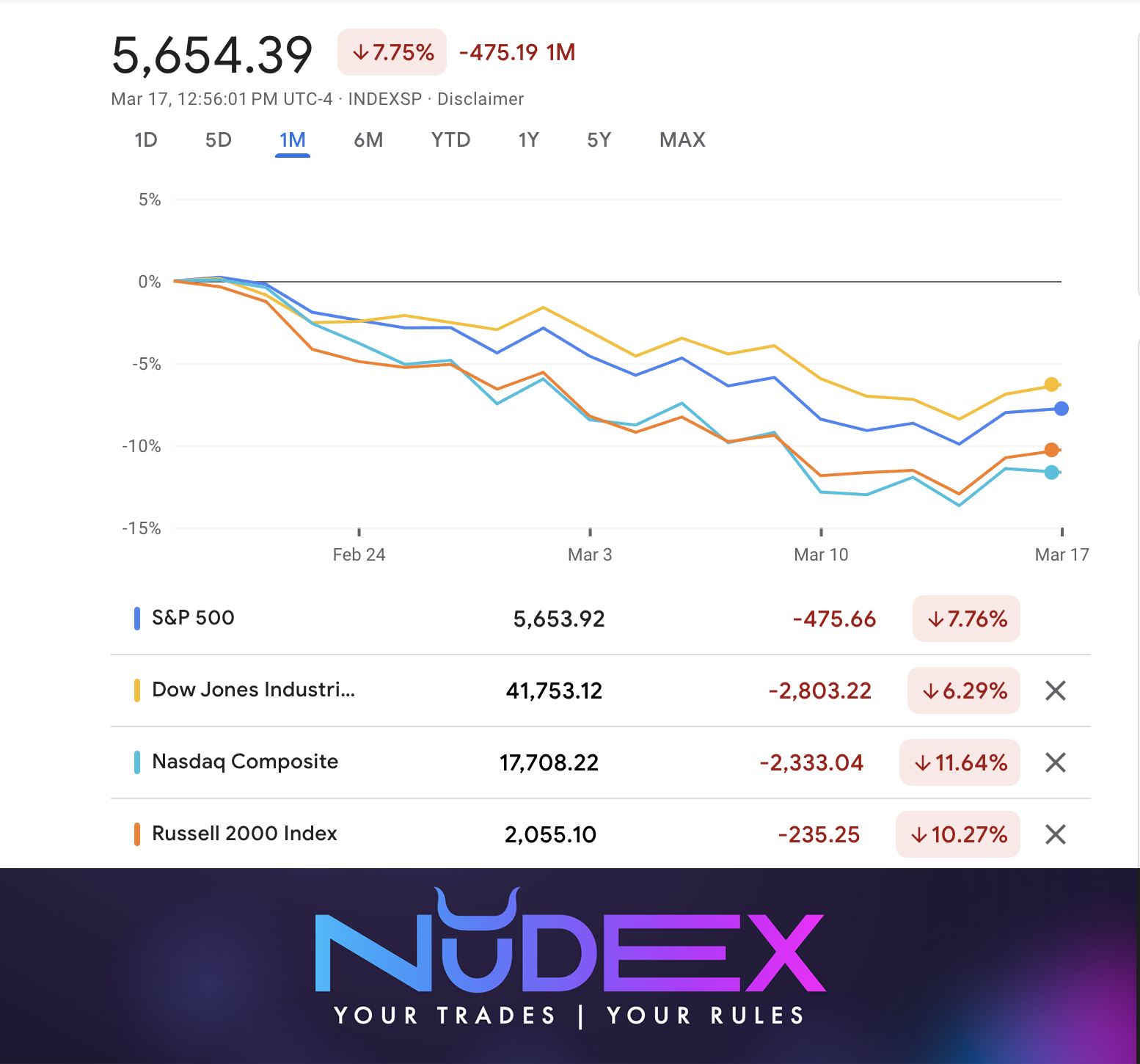Stock markets on Wall Street and in Europe saw declines this week that are already entering the correction zone (more than -10%), reflecting investor nervousness about the possibility of an economic recession. For example, the Dow Jones Industrial Average closed down 1.48%, while the S&P 500 lost 1.76%, the largest daily drop of the year. The Nasdaq Composite dropped -2.64% on average across all days of the week, resulting in a cumulative decline of -10% below historic highs.
