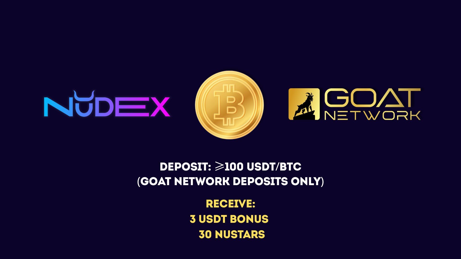 GOAT Network Bonus: Deposit via GOAT Network and receive an extra 30 NuStars!